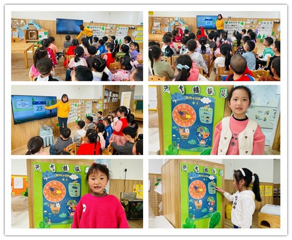 幼儿站在“天气预报员”墙面前,体验当天气预报主持人。这一活动,帮助幼儿养成每天关注天气预报,根据气温变化增减衣服的良好生活习惯。