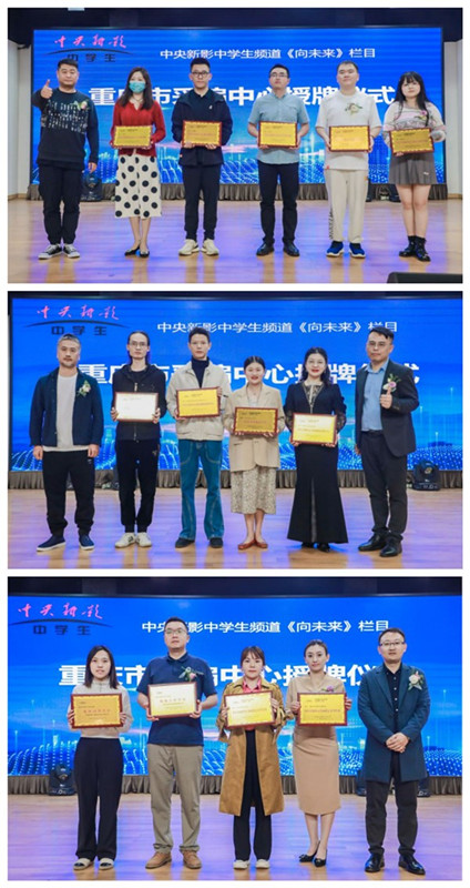 致辞结束后,由郭欣阳教授、李季风导演、栏目重庆负责人赵岩、栏目川渝采编中心主任丁沛霖分别向合作老师、合作机构、合作基地分别授牌。