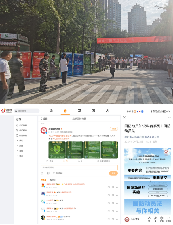 9月21日“全民国防教育日”期间,各市(州)国动办运用《国防动员知识科普系列》海报,迅速掀起“全民国防教育月”线上线下各类活动热潮,既引导了群众学习掌握国防动员相关法律知识、基本常识,又增强了群众的国防观念和防空减灾意识。