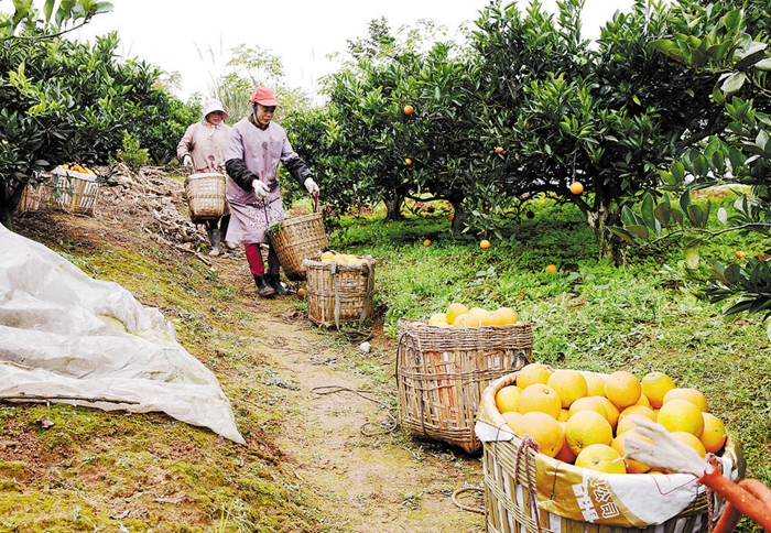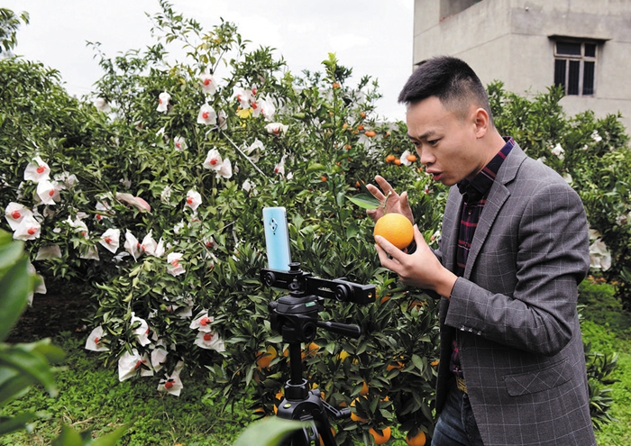 12月10日,金堂三溪镇金峰村17组,村民陶彪在果园里直播销售脐橙,他每天收到的订单约有500斤。这几年,金堂三溪镇电商和800村民微商大行其道,成为三溪脐橙销往全国的主力军,每年约三分之一的鲜果是从电商渠道走向全国,仅当地知名电商金堂县白云果园农民专业合作社每天销往外地的脐橙就有3万斤。