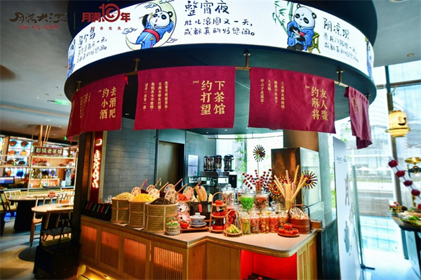 十年过去,城市日新月异,2022年成都总人口已超过两千万,已开通地铁十二条,成都天府国际机场加双流机场吞吐量已位居全国前列。越来越多的游客来到成都,感受成都,品味成都。吃一顿地道的成都火锅、去老茶馆喝碗盖碗茶、去锦里、建设路小吃街打卡成为了游客的必备攻略。2020年,月满大江商场模型——万象城店正式开门营业,让消费者“坐在茶馆里吃火锅,享受地道成都味”的愿景得以实现,门店以成都传统茶馆为原型进行设计,藤椅、竹编、盖碗茶,茶馆里烫火锅,火锅店内喝茶,自在悠闲慢品,妥妥的成都范儿。
