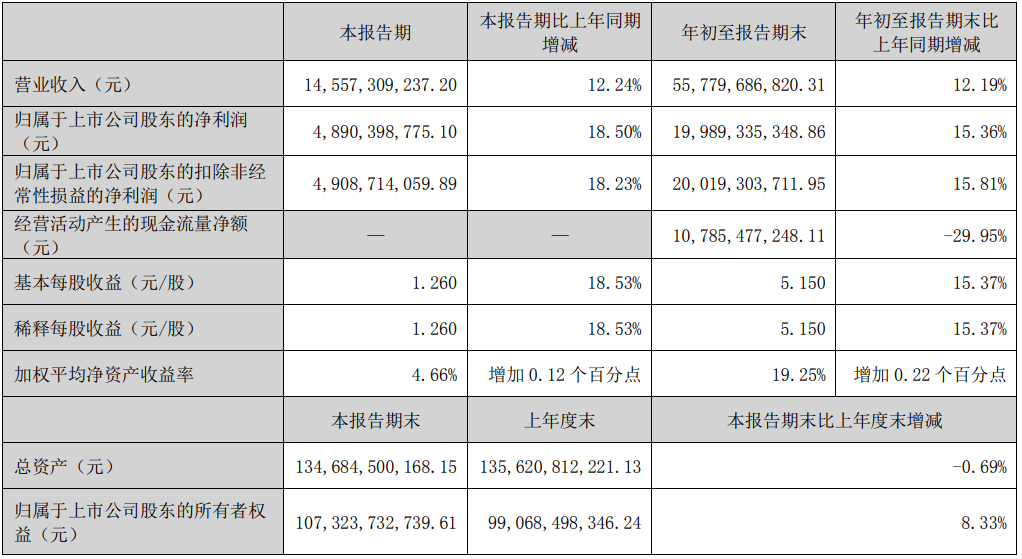 四川新闻网成都10月28日讯 10月27日,五粮液股份公司发布前三季度业绩报告,今年1-9月,五粮液实现营业收入557.80亿元,同比增长12.19%;归属上市公司股东的净利润199.89亿元,同比增长15.36%。