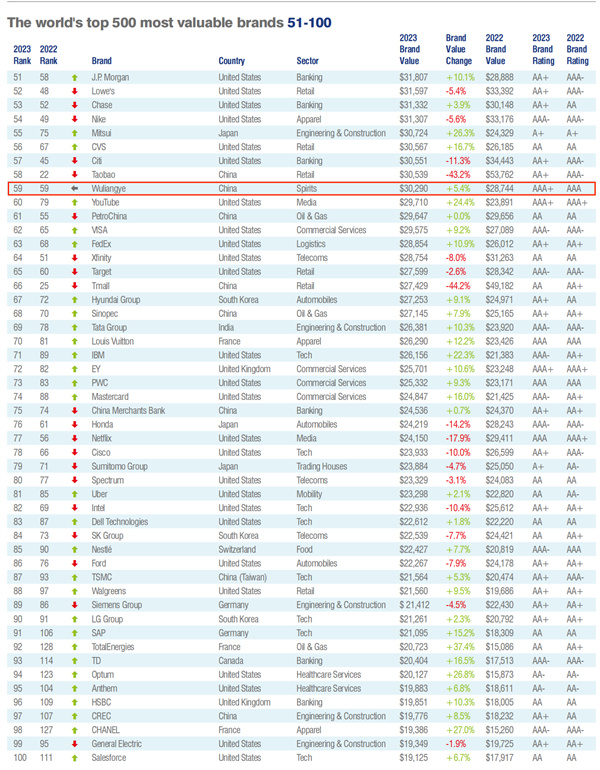 四川新闻网成都1月26日讯 1月18日,全球领先的品牌价值评估与品牌战略咨询公司Brand Finance在瑞士达沃斯发布2023年“全球品牌价值500强”榜单。五粮液以302.9亿美元的品牌价值位列榜单第59位,品牌强度评级(Brand Rating)达到AAA+(全球最高级别)。