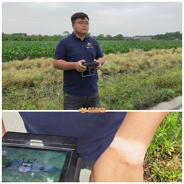四川新闻网成都5月8日讯 在崇州大划街道的农田边,记者见到了崇州市万茂土地股份合作社农业职业经理人、万茂欣欣农机专业合作社创始人舒星宇,黑黑壮壮的他正跟团队的小伙伴们一起,用无人机给田里的秧苗施肥撒药。说到他为啥比别人要黑,他很不服气的摘下手表,露出因手表遮盖没被太阳“吻”过的那一小块白皙的皮肤,“我本来是很白的呀,只是这几年天天在田里晃悠,晒黑的。他们虽然也在田里,但是他们都是全副武装!”