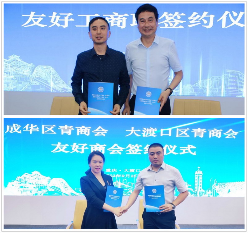 在双方参会人员的共同见证下,大渡口区工商联与成华区工商联签订了《友好工商联合作协议书》,成华区青商会会长姚静与大渡口区青商会执行会长贺鑫签订了《友好商会协议书》,此举正式搭建了两地工商联及直属商协会交流合作的平台。参会的双方企业家代表及商协会负责人表示,将以此次缔结友好工商联、友好商会为契机,进一步强化友好交往、经验交流;进一步做到信息互通、资源共享,携手并肩,实现互利共赢。(张娅芹 张静)