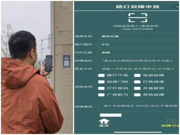 近年来,崇州“掌灯者”一直秉承低碳环保、智慧节能理念,不断探索照明监管新举措。2023年6月份以来,为进一步提升城市照明维护效率,崇州市综合行政执法局联合路灯运维单位开发“路灯维修故障申报”的微信APP(基于微信的手机应用程序),并于2023年8月正式“上线”。市民群众若发现路灯有不亮、灯杆歪斜、破损等安全隐患,通过微信扫描路灯上张贴的“二维码”,就能够一键上报相关信息,包含路灯位置、灯型、编号、故障类型等。APP后台与智慧照明平台结合,运维单位可实现维修派工、故障处理前后图片对比、处理结果反馈、无纸化记录存档,能大大缩短维护时间,减少城市照明维护死角,进一步提升城市照明管理的智能化信息化水平。