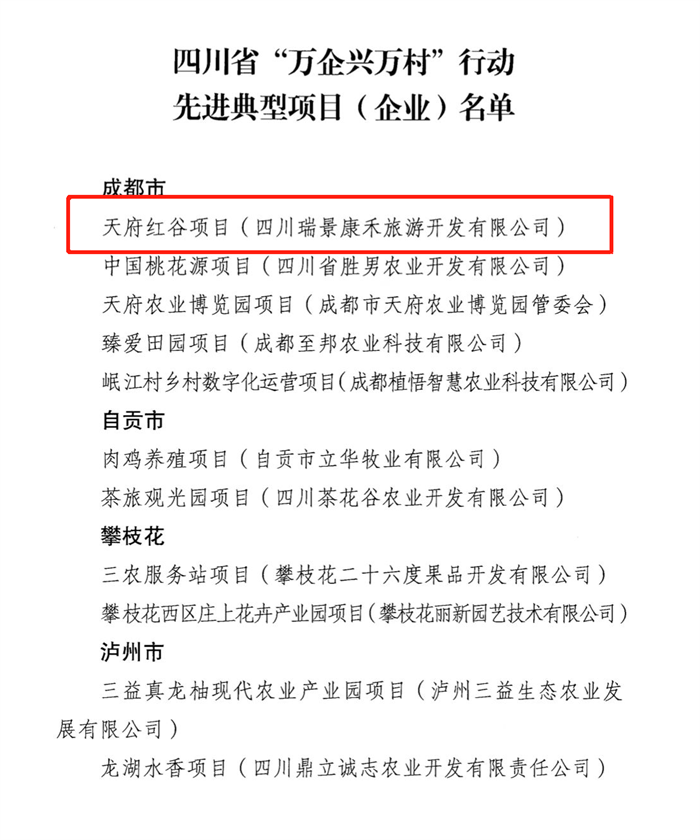 四川新闻网成都12月28日讯 12月26日,四川省“万企兴万村”行动领导小组通报了四川省“万企兴万村”行动先进典型项目(企业)名单,成都邛崃天府红谷项目(四川瑞景康禾旅游开发有限公司)入选。