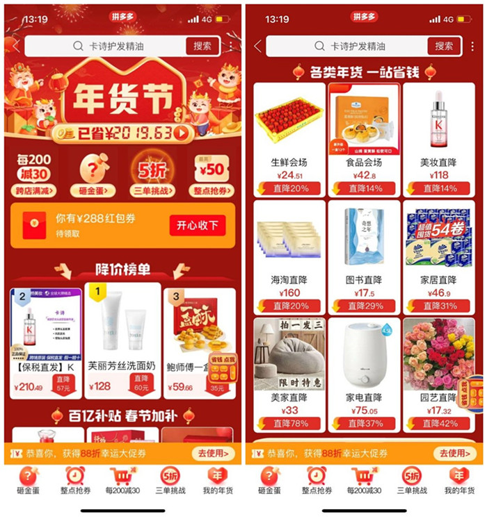 在拼多多客户端搜索“年货节”即可点击进入大促主会场。进入会场后,可领取优惠券,也有机会获得288元大促券,此外,会场内设置砸金蛋、三单挑战、整点抢券等活动。