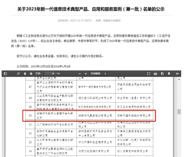 四川新闻网成都1月12日讯 工业和信息化部去年年底发布《关于2023年新一代信息技术典型产品、应用和服务案例(第一批)名单》,双流区工商联副主席单位——成都千嘉科技股份有限公司的“城镇燃气数字化管理平台创新应用”成功入选“2023年新一代信息技术典型产品、应用和服务案例(第一批)工业互联网平台创新领航应用案例(数字化管理方向)”。