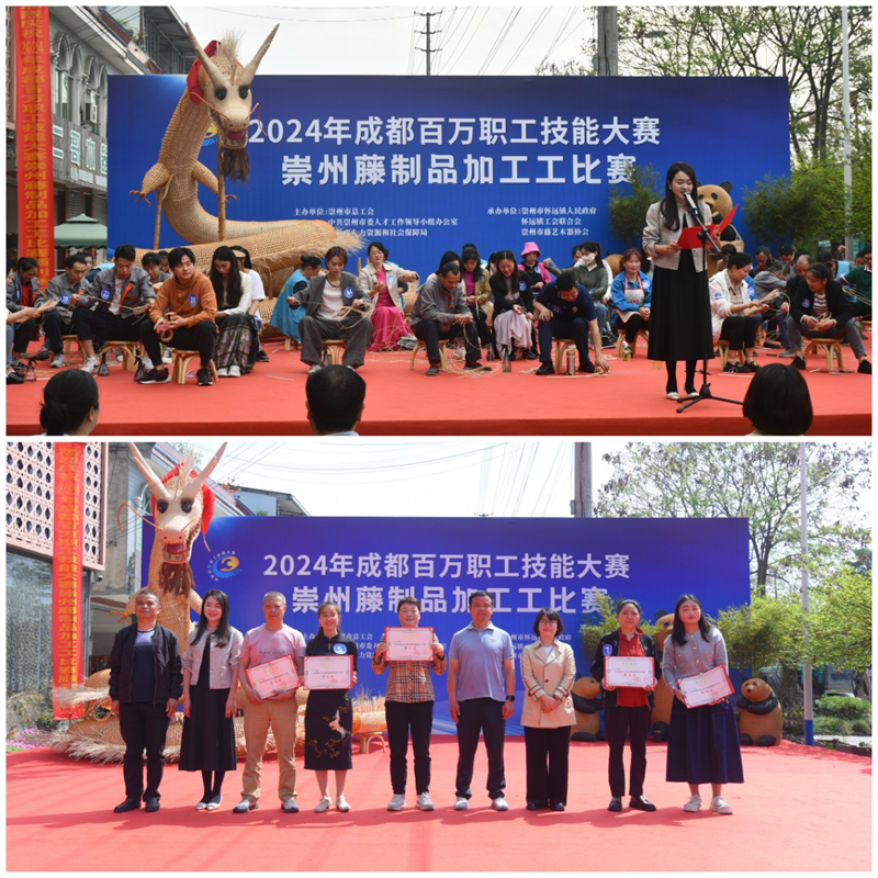 四川新闻网成都4月2日讯 藤龙展技艺,巧手编百花。4月2日,“2024年成都百万职工劳动和技能竞赛崇州藤制品加工工比赛”在怀远镇藤编一条街举行,51名藤编匠人同台竞技,一较高下。