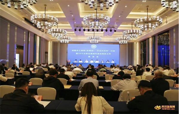 四川新闻网成都4月26日讯 4月25日,成都市工商联(总商会)“万企兴万村”行动暨39个欠发达县域托底性帮扶工作推进会顺利举行。四川省委统战部副部长、省工商联党组书记唐强,省工商联党组成员、副主席孙宁,省工商联副主席、成都市工商联主席俞建,市工商联党组成员、副主席盛成皿,省同城化办公室专职副主任吴小冬,市农业农村局总经济师陈晓波,大邑县委常委、统战部部长李冲宇出席会议,成都各区(市、县)和炉霍县、得荣县、巴塘县、黑水县、红原县5个结对县域工商联负责同志,以及开展结对帮扶工作的商会会长、秘书长、企业家等200余人参加会议。会议由成都市委统战部副部长、市工商联党组书记廖俊主持。