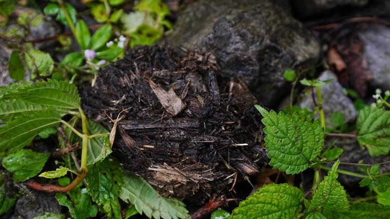 在桃子坪和清水池垭口,巡护队员终于发现了两处大熊猫便便,也就是俗称的“青团”,颜色已不是新鲜粪便的绿色,而呈黄黑色,里面还掺杂有竹子样的残留物,何可告诉记者,这两处粪便应该是6—8个月前拉的,为同一只健康的青壮年大熊猫所排。从粪便里的竹节纤维,也印证了“大熊猫吃什么拉什么”的事实。