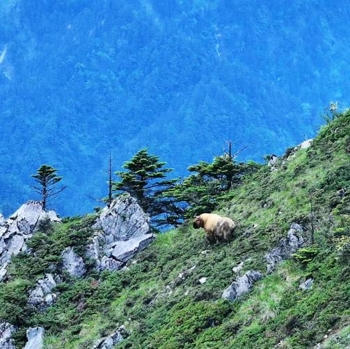 “快看,羚牛!”一声惊呼让大家激动起来。在月亮湾旁海拔3600米的八卦顶接近山顶的地方,一头雄壮的羚牛正在吃草。它看了看巡护队,然后不疾不徐地离开,隐没到山的另一边。大家用相机、无人机记录下羚牛出现的全过程。这是巡护队几天来,难得的与野生珍稀动物近距离接触的经历。