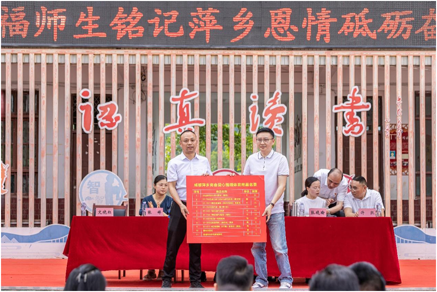 座谈会结束后,商会一行人来到五福镇小学,开展爱心助学活动。成都萍乡商会执行会长李锋向学校交付了捐赠的体育器材清单。商会监事长罗战萍、常务副会长刘世军等人向18位特困家庭学生发放了助学金。