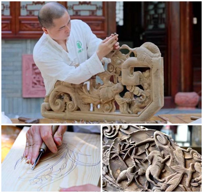 廖家木雕起源于清朝末年,这项雕刻技艺以楠木、樟木等为原材料,以选材、构图、精修等为主要工艺,主要用于民居建筑构件和实木家具的雕饰。经历百年的发展,廖家木雕形成了用料考究、民居雕饰图案写意、题材丰富且生活化气息浓厚,雕法灵活多样、刀工讲究“气韵”连贯性和一戳成型等主要特征。