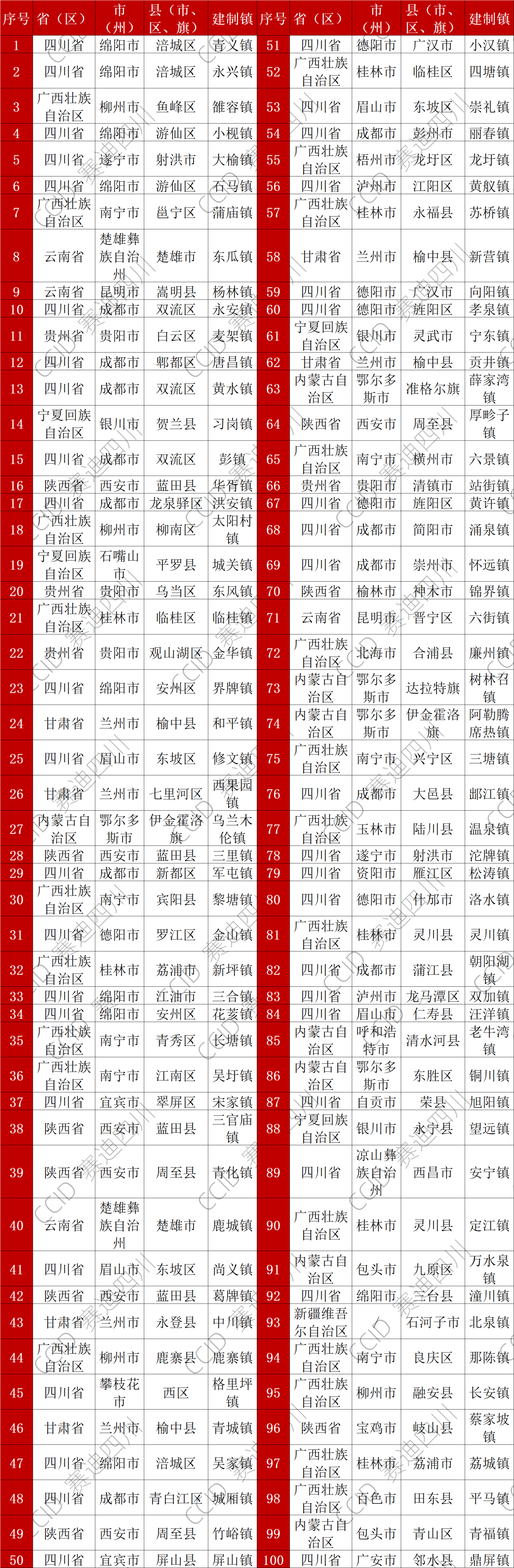 在镇域创新发展潜力西部100强中,成都市双流区永安镇第10名,成都市双流区黄水镇第13名,成都市双流区彭镇第15名。完整榜单如下:
