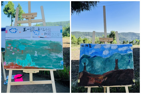 户外场景化的教学拓展了儿童美育空间。孩子们在主教们的指导下认真地作画。他们有的画出了远处的群山,有的画出了丰收的田地,还有的画出了绿意盎然的树木和古朴的农舍……每一幅画都展现了孩子们对自然与家乡的观察与情感。大家在表达自然美和艺术美的同时,也提升了保护自然、热爱家乡的自觉意识。