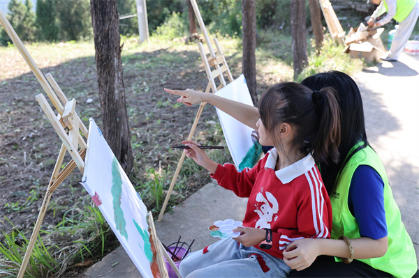 “不仅要画你看到的景色,还要画出你对景色的感觉与想法。”志愿者中担任主教的都是具备美术功底的专业人士,每名主教负责5-6名学生,他们耐心地讲解着绘画的技巧和注意事项,引导孩子们发挥想象力,学习怎样运用线条,怎样使用颜料,怎样将观察到的自然变成一幅绘画作品。助教们则在一旁协助布置场地,整理用品。老师与孩子们一起,共同营造了一个温馨而和谐的创作氛围。