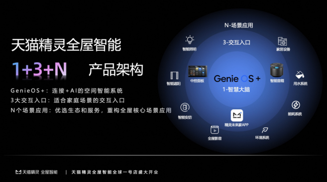 成都富森美家居天猫精灵全球一号店,便生动展示了天猫精灵如何通过全屋智能1+3+N产品架构,驱动未来家庭空间美好生活迈入现实:“1”个“Genie OS +”空间大脑,连接起“3”个交互入口——中控面板,精灵未来家App与智能音箱,建构起包括家居设备、智能遮阳、全屋影音在内的N个场景应用,让智慧美好生活触手可及。