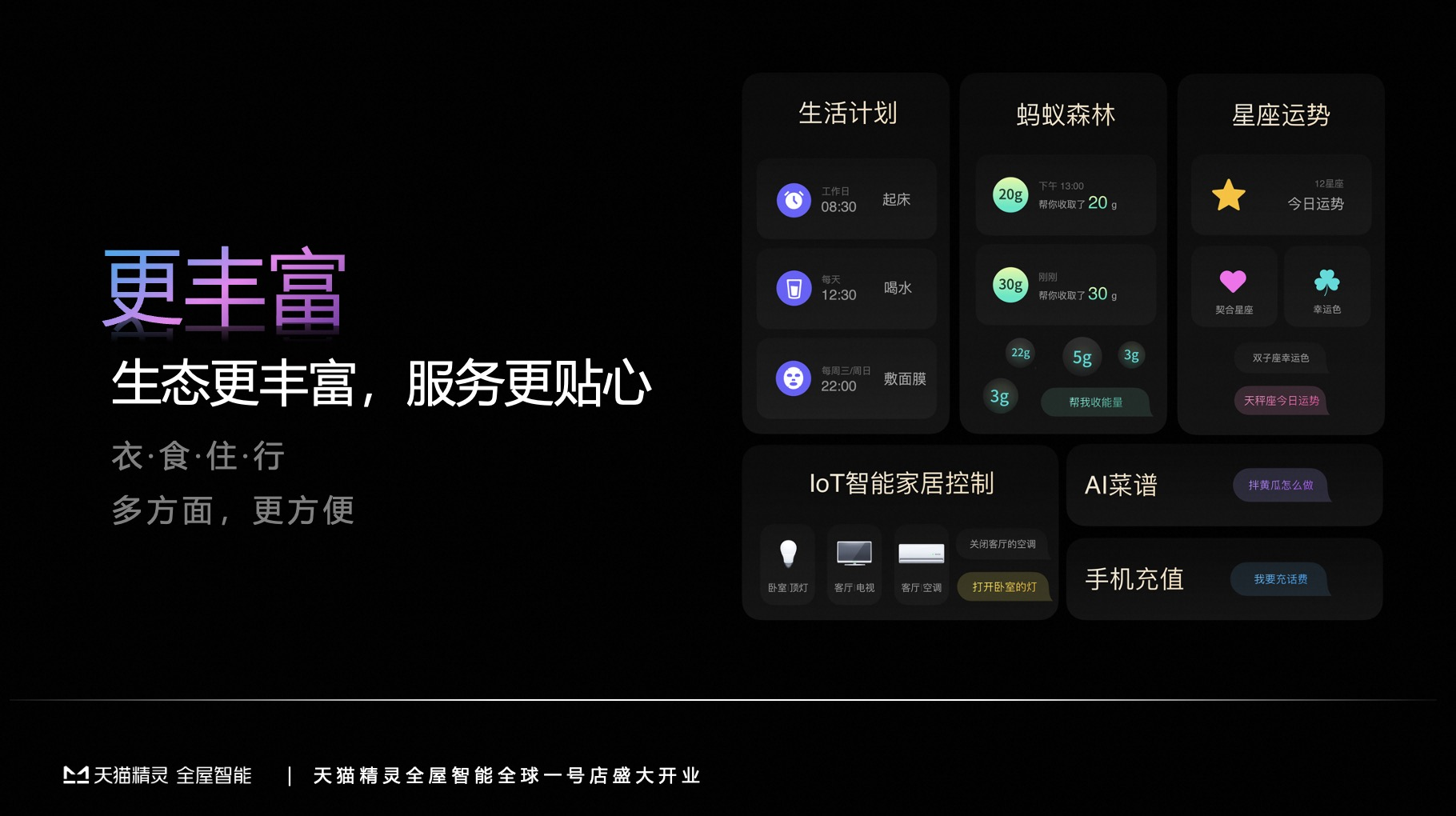 为提升全屋智能的智能性,拓展生活场景应用的丰富性,天猫精灵推出首个全屋空间大模型应用精灵卡牌,该功能可通过大模型实时生成回复,并基于记忆为用户提供个性化服务。在辐射300余个品类1600家品牌的基础上,天猫精灵还升级了语音购、快递物流、外卖服务、生活缴费等服务应用,进一步拓展AI家居生活场景化服务的无限可能。