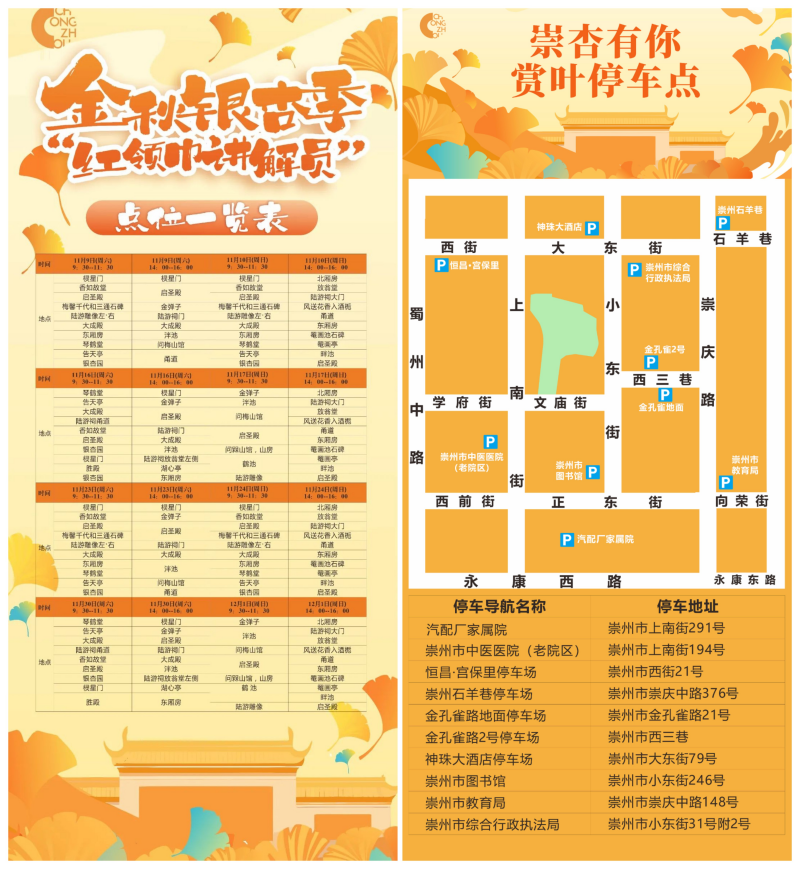 银杏季期间,尤其是罨画池景区周边人流、车流较大,建议游客朋友们优先选择外围停车场以及市政道路泊车位停车,同时,还可以关注车载广播(FM102.2)等平台发布的客流信息,提前规划行车线路。交警部门还将根据实际车流量,在景区周边道路临时设置停车指示牌,供车辆临时停放。