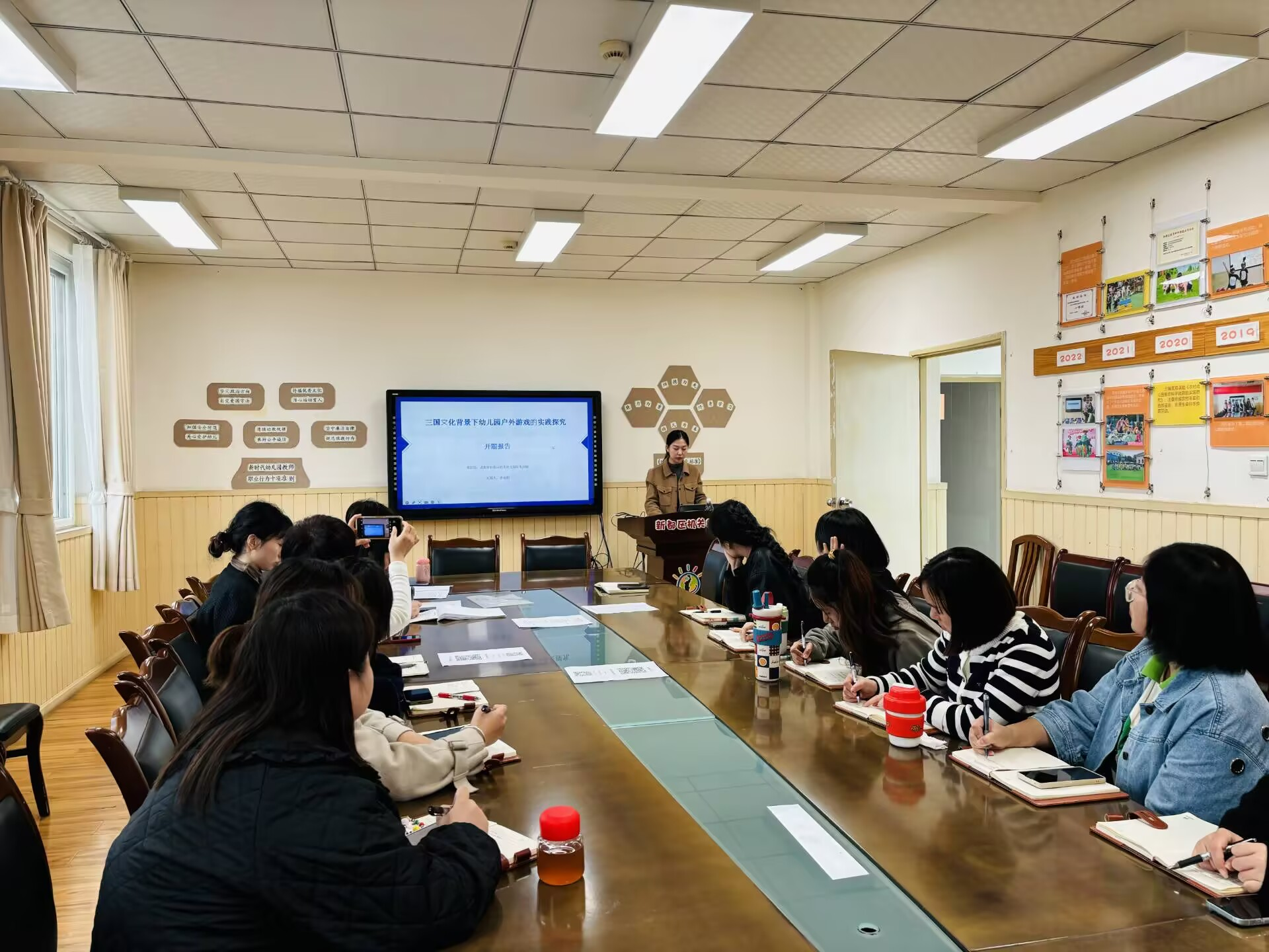近日,新都机关幼儿园“杨雪名师工作室”成员前往机关幼儿园军屯分园,开展了以“课题研究实践指导”为主题的送教活动。本次活动分别由老师梁艺乔带来主题为《如何撰写开题报告》的专题分享,以及老师李雨桐对军屯分园课题《三国文化背景下幼儿园户外游戏的实践探究》开题报告的汇报。