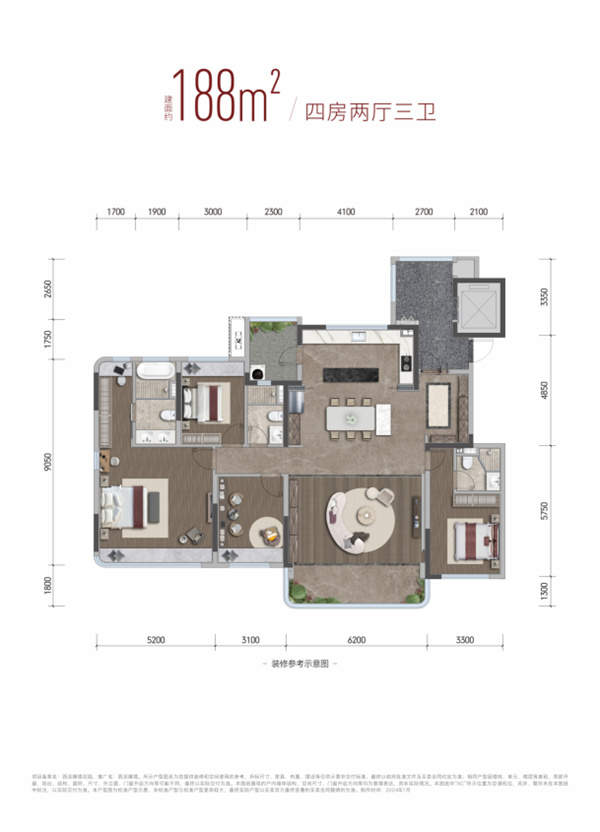 目前主力在售的建面约188㎡朗境户型,双套房设计+每间卧室9㎡以上+主卧行政级套房的基础上,还做到了休息区面积近30㎡+3个开窗。
