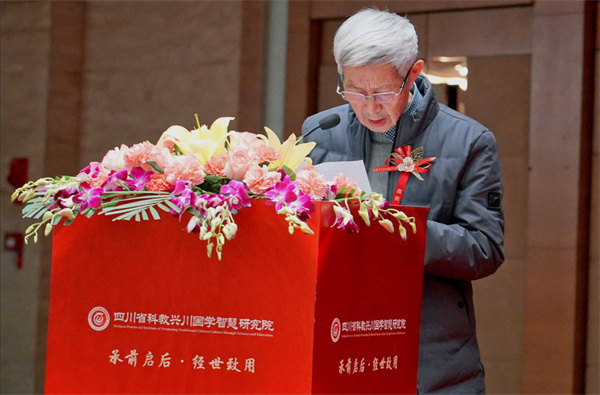 在成立大会上,四川省文化和旅游厅原副厅长,省非遗协会专家委员会主任赵红川发表了讲话致辞。他首先对国学智慧研究院的成立表示祝贺,他强调国学文化所代表的中华优秀传统文化,是中华文明的智慧结晶和精华所在,是中华民族独特的精神标识,是中华民族的根和魂,更是维系全世界华人的精神纽带和共同基因。他对国学智慧研究院的成立提出三点要求:要从国学文化的传承中找到共同基因与民族精神凝聚力;要从国学思想的探索中开启人生价值与事业发展新思路;要从国学智慧的践行中展示文化自信与文化兴业新成果。