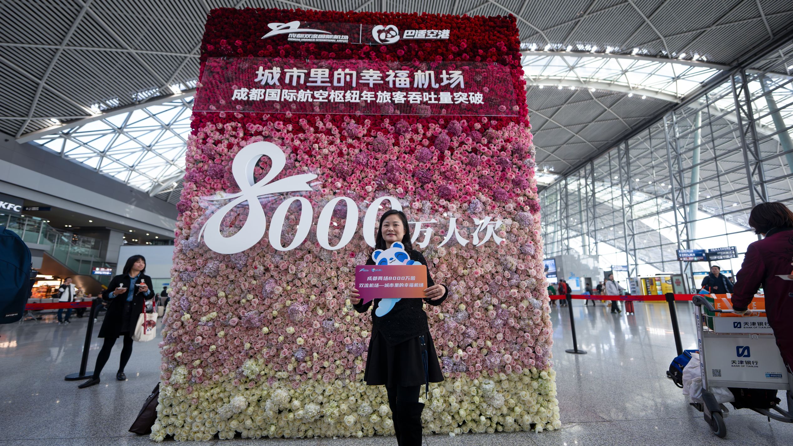 11月28日,随着来自北京的川航3U8890航班平稳降落在双流国际机场,成都国际航空枢纽迎来第8000万名旅客,标志着在实施“两场一体”运营三年半后,成都国际航空枢纽年旅客吞吐量正式突破8000万人次。