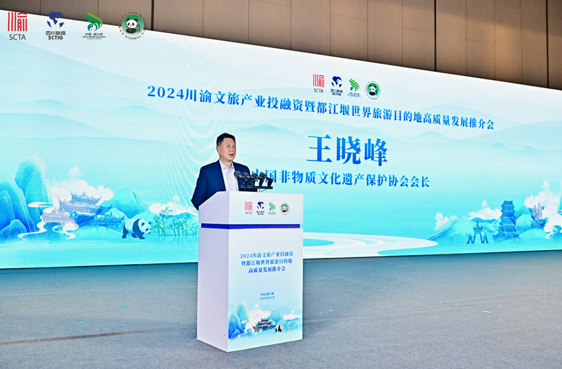 中国非物质文化遗产保护协会会长王晓峰在致辞中对此次活动给予了高度评价和认可。他指出,今年正值成渝地区双城经济圈建设第5年,此次活动成功搭建起川渝两地政府之间、政府与企业之间的广泛交流合作平台,对打造巴蜀文旅走廊、促进成渝两地文旅产业高质量发展具有重要意义。中国非遗保护协会期待与地方政府、行业协会、企业主体开启更多合作模式,抢抓文旅发展窗口期,助力川渝两地文旅产业高质量发展行稳致远、更上层楼。