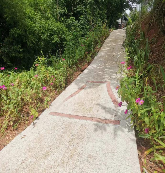 青龙村1组70岁独居老人冯某,丈夫和儿子先后服役南疆北疆,为国戍守边关。父子俩先后退伍回乡务农,儿子结婚入赘女方,丈夫后来因病去世,冯某一人生活了二十余年。家门口50多米长的入户土路未硬化,特别到了下雨天更是又烂又滑,给生产生活带来了严重不便,且因该路段坡度陡,还存在较大的安全隐患。雷勇实地了解情况后,很快向自己的派出单位成都东部新区税务局的领导做了汇报,并谈了自己的想法,得到了领导的大力支持,在局内建起了复转军人钉钉群并发出捐款倡议。雷勇虽然没当过兵,也带头捐了款。在大家的爱心帮助下,于2024年2月底为冯某家修建了一条嵌有“八一”字样的入户便道,大大方便了出行,消除了安全隐患,解决了后顾之忧。雷勇自始至终全程参与了入户便道的设计和施工。为了防止路基垮塌和美化环境,他还自己掏钱买来树苗和花籽,栽撒在路的两旁。