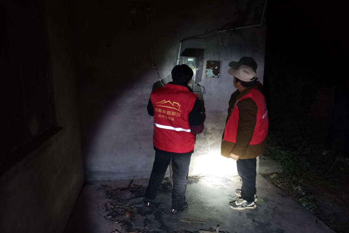 雷勇(左)晚上参加村民安全用电等隐患排查