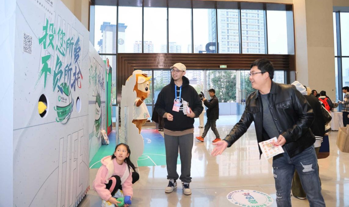 赛场外,“国寿牛犇犇”同样成为了最吸引眼球的焦点。在中国人寿保险股份有限公司成都市分公司专设的保险咨询宣传区,“犇犇”与小球迷们展开了激烈的投沙包趣味小游戏,让小朋友们在享受游戏乐趣的同时,也增强了对篮球运动的兴趣。此外,“犇犇”还引导现场观众参与扭扭蛋互动游戏、主题合影等活动,让球迷们在极具篮球动感风和中国人寿元素的广告墙前留下了难忘的瞬间。