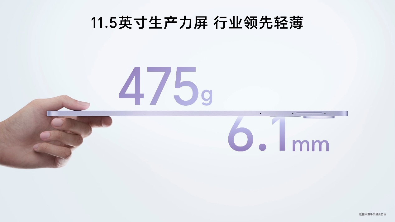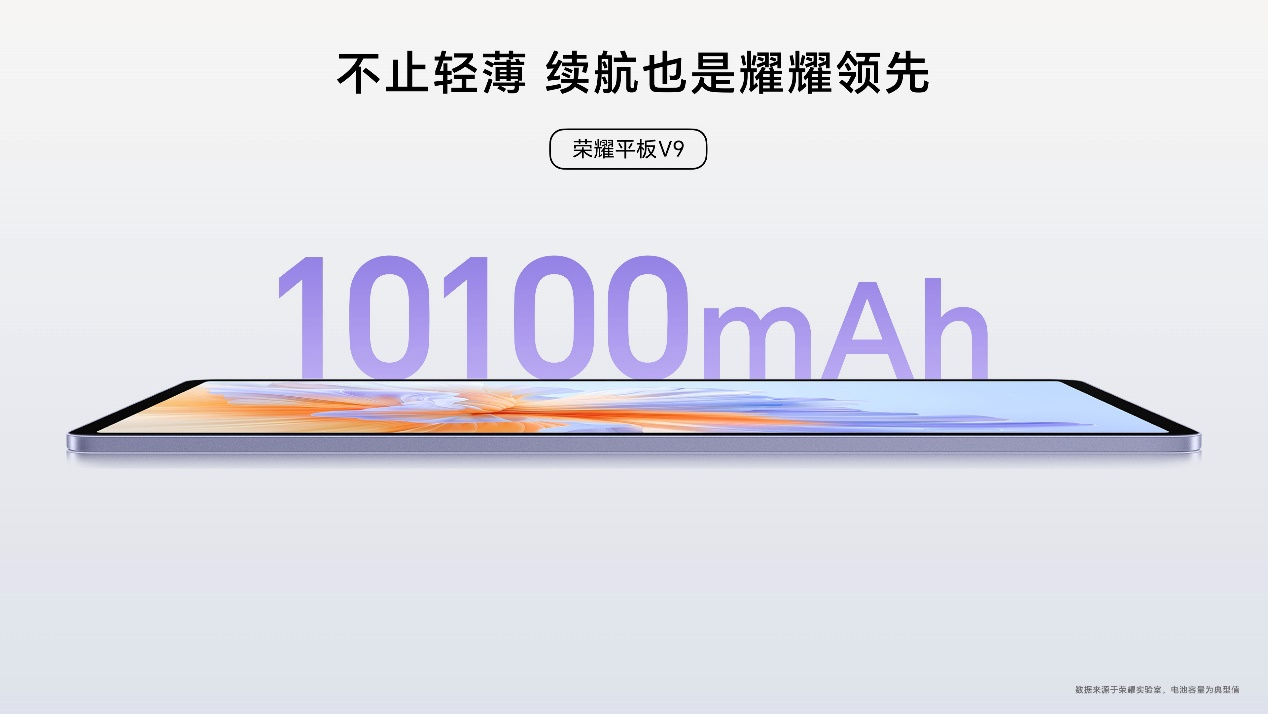 荣耀平板V9采用全金属一体化机身,拥有庐烟紫、玉龙雪、苍山灰三款多巴胺国风配色。同时,荣耀平板V9以仅475g的重量和6.1mm的机身厚度,成为同尺寸级别最为轻薄的产品之一,为大学生日常上课提供了极佳的便携性。