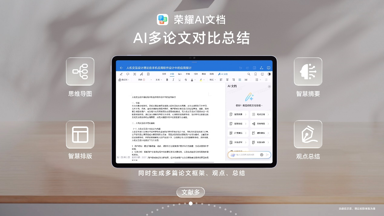 面对文献阅读等大学生高频使用场景,荣耀平板V9搭载行业首个自研AI文档——荣耀AI文档,实现了一站式文档处理。 在兼容性方面,荣耀AI文档支持CAD、XMIND、EPUB、CAJ等多格式文档,无需跳转到指定APP即可轻松查看。通过文档内置的AI功能,用户不仅可以实现一键排版、摘要、观点总结,更能在文档内直接生成思维导图并编辑导出,同时荣耀AI文档还支持润色、风格改写、扩写、缩写等功能,让创作更加轻松。另外,多论文对比总结、AI文档问答、公式编辑等特色AI功能,也进一步助力文献阅读效率提升。