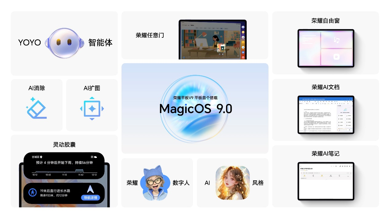 搭载MagicOS 9.0系统,荣耀平板V9除了进一步强化AI学习生产力之外,还具备YOYO智能体、荣耀数字人、荣耀任意门、跨设备信任环等功能。配件方面,作为学习工作效率翻倍的好搭子,全新荣耀Magic-Pencil 3拥有4096级压感和低至2ms的超低时延,不仅极大提升了用户的书写体验,还能实现隔空翻页、隔空刷短视频等操作。