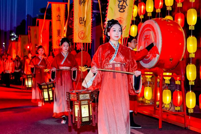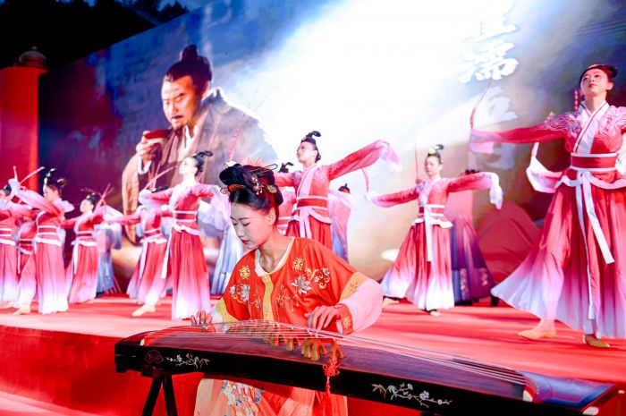 凤舞云端,直上九霄。昆山玉碎凤凰鸣,芙蓉泣露香兰笑。第二篇章《礼》以古乐器、雄浑鼓声、灯光展演为主,在庄重的氛围中,将杜甫、苏东坡、黄庭坚、范成大、陆游等曾造访过宜宾的古代名家以艺术笔触进行情景式融合展演,在一步一景中,将历史重现于眼前,让超越时代的风华与匠心情怀,流淌出无尽的诗意。