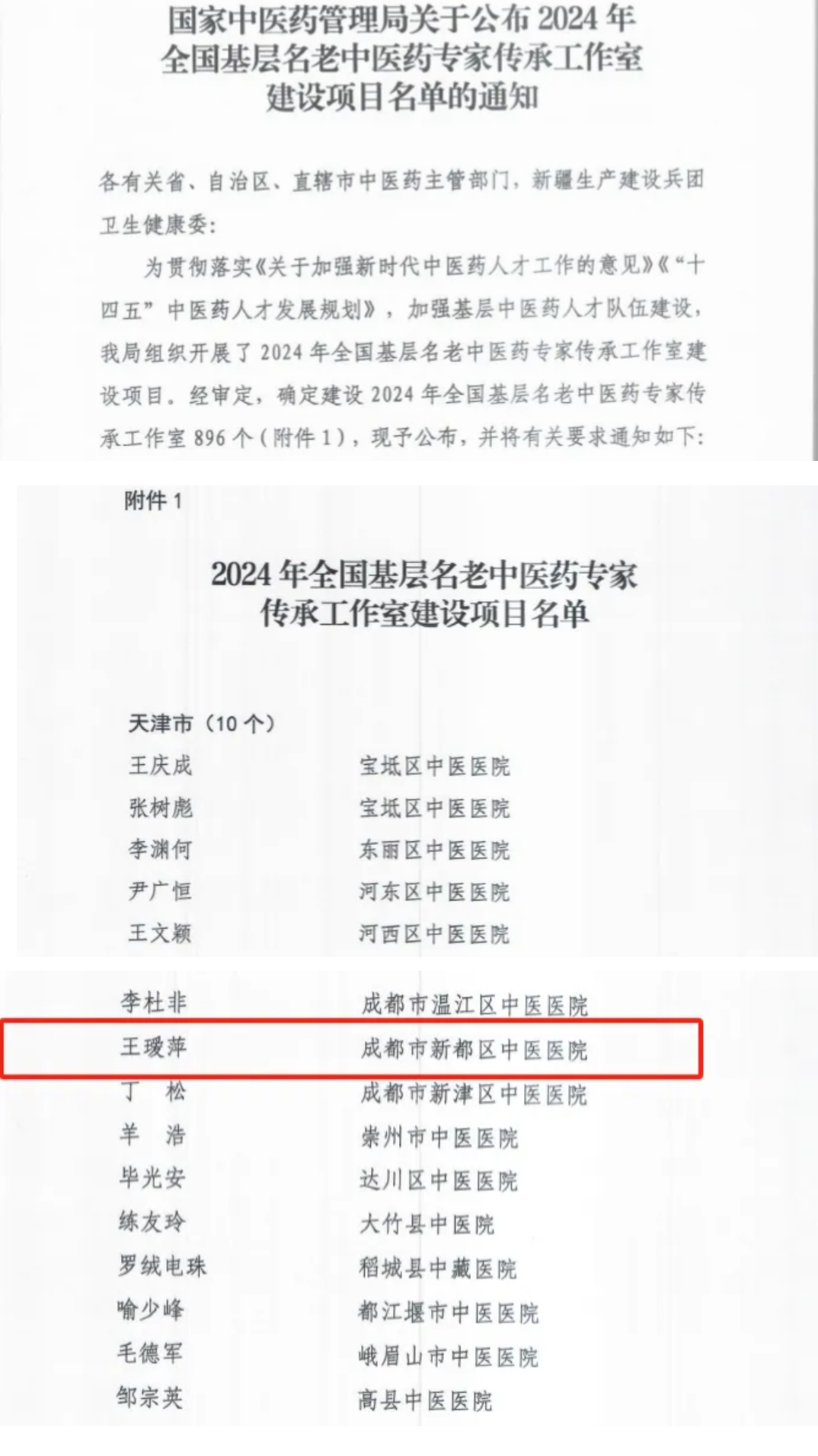 近日,国家中医药管理局公布了2024年全国基层名老中医药专家传承工作室建设项目名单,新都区中医医院王瑷萍主任中医师成功入选,这是新都区医疗卫生系统首个全国基层名老中医药专家传承工作室。这不仅是对医院中医药工作的高度认可,更是新都区中医药传承创新工作的一次突破。