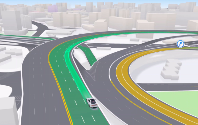 例如,针对复杂分岔、连续路口等场景,将突出道路空间结构关系,辅助用户秒懂车道级引导信息;针对大曲率弯道、立交桥等场景,将动态调整导航视角以获取超视距信息,帮助用户更好的提前预判应对;基于精准车道级定位,导航还可实现基于当前自车位置的精细化引导,快速识别偏航和纠偏。