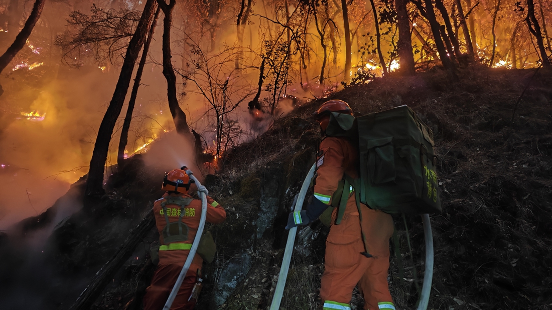 3月19日,四川森林消防员架设水泵奋力阻截林火越过318国道(曾鹏)