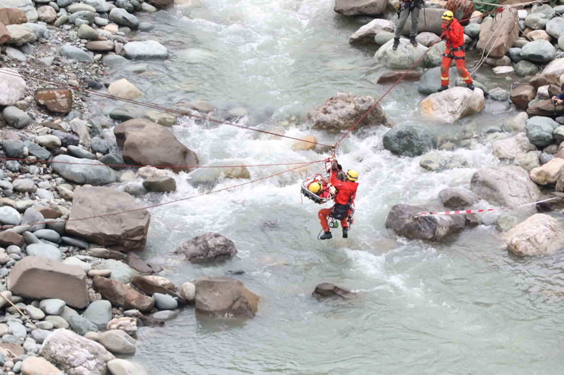 10月16日,首届天府之光第二比赛日,在绝境求生科目上,一名队员用肩膀扛起绳索,避免队员转运伤员时被湍急的河水打湿伤口,造成二次伤害(曾鹏)