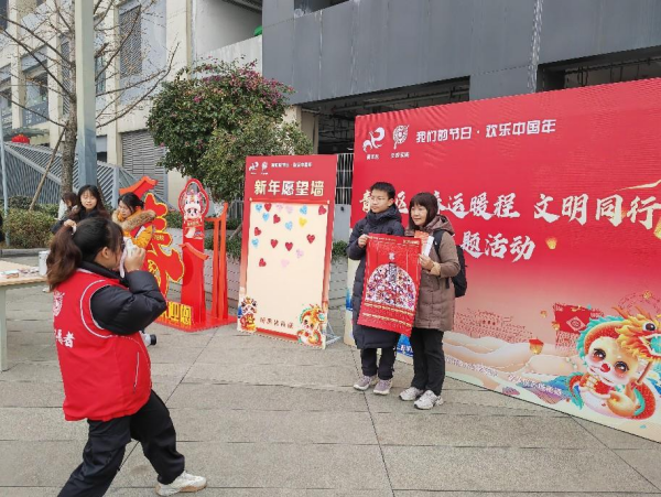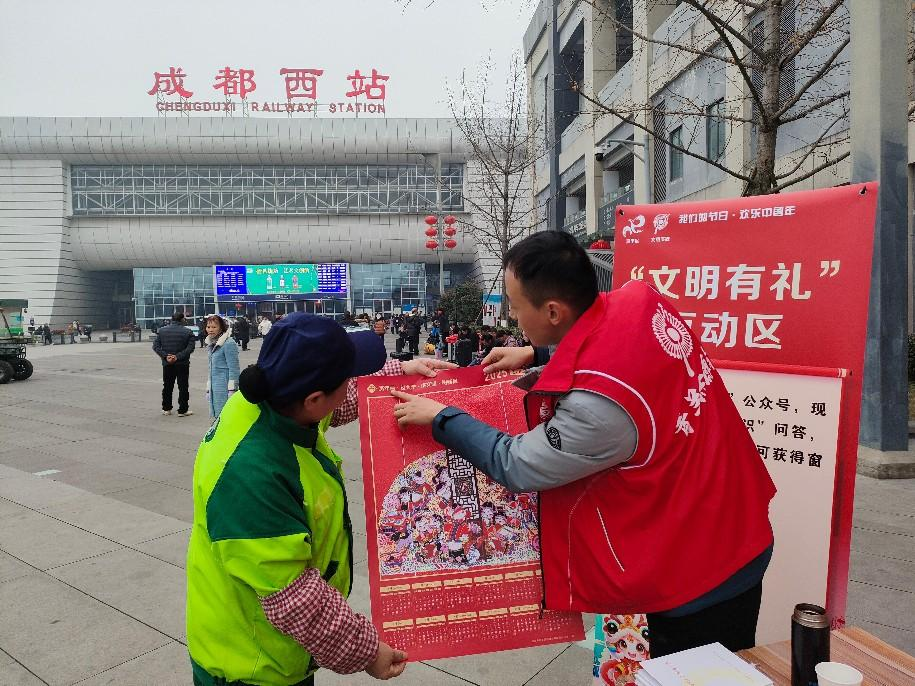 随着出站和进站的旅客逐渐增多,大家都纷纷来凑热闹,写一个心愿、领一份年画、拍一张照片,在感受新春的氛围同时,也让文明和祝福一路同行。(图文由青羊区委宣传部提供)