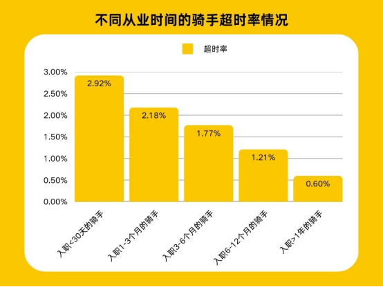 调研发现,30天以内的新骑手超时率是一年以上的老骑手的5倍 (数据来源:美团研究院)