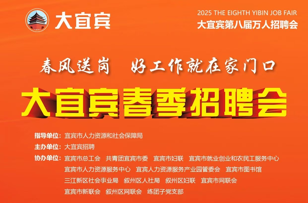 春风裹着暖意,吹开了就业新机遇!本次春季招聘会得到了宜宾市人力资源和社会保障局指导,由大宜宾招聘主办,宜宾市总工会、共青团宜宾市委、宜宾市妇联、宜宾市就业创业和农民工服务中心、宜宾市人力资源服务中心、宜宾人力资源服务产业园管委会、宜宾市图书馆、三江新区社会事业局、叙州区人社局、叙州区妇联、宜宾市网联会、宜宾市新联会、叙州区网联会、练团子党支部共同协办。