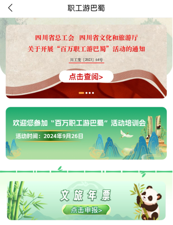 “百万职工游巴蜀”活动参与方式便捷高效。基层工会可通过四川省总工会“川工之家”APP或“蜀光惠”数字消费平台(APP或小程序)“百万职工游巴蜀”专区为职工线上办理文旅年票,职工领取年票后,即可在平台激活并预约景区门票、文化观演活动等,享受便捷的文旅服务。平台还提供丰富的线下消费场景,职工可通过平台自主选择酒店住宿、文创产品、影音视听、阅读书屋、运动装备等,满足多元化消费需求。