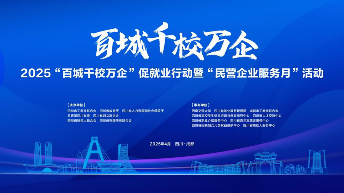 2025“百城千校万企”促就业行动暨“民营企业服务月”活动将于4月14日(星期一)在西南交通大学犀浦校区举行。本次活动由四川省工商业联合会、四川省教育厅、四川省人力资源和社会保障厅、共青团四川省委、四川省妇女联合会、四川省残疾人联合会、四川省归国华侨联合会主办,西南交通大学、四川省就业服务管理局、成都市工商联、四川省高校学生信息咨询与就业指导中心、四川省人才交流中心、四川省职业介绍服务中心、四川省青年志愿者服务中心、四川省妇联妇女儿童权益维护中心、四川省残疾人服务中心承办。