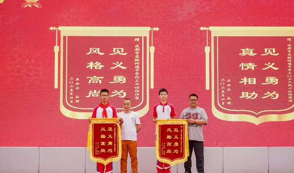 4月21日上午,成都市树德实验中学举行了一节特别的朝会课,学校初三7班的但沛宸、初二10班的杨明浩两位同学收到了辖区居民赠送的“见义勇为 风格高尚”锦旗,以表彰他们勇救落井群众的事迹。